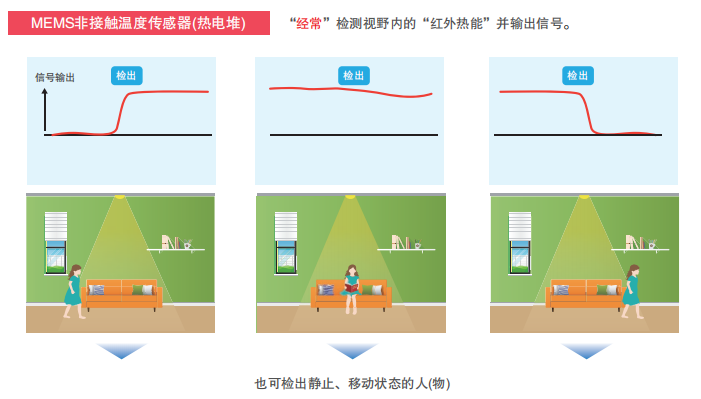 焦电传感器和MEMS非接触温度传感器都是接收红外线微弱的热能并输出信号的传感器。焦电传感器无法检测静止状态的人(物),而MEMS非接触温度传感器可以检测静止状态的人(物)。