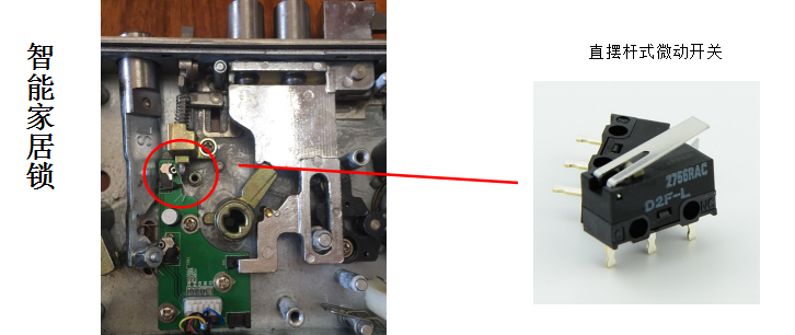 现如今市面上智能锁已经运用得很广泛,而我们所知道的:其中微动开关是可运用在智能锁里,是做锁舌的位置检测, 用以告知IC目前锁的状态--开锁 or 关锁。但这类开关多为直摆杆式的, 如欧姆龙微动开关的D2F-L,见下图:
