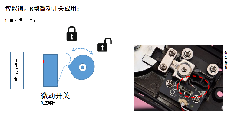 但除了这种常规的直摆杆型微动开关, 还有一种R型摆杆的微动开关也在智能锁里应用; 见下图; R型摆杆的微动开关, 用在室内侧, 类似于反锁的机制;事实上不是反锁, 该功能叫“室内侧止锁”, 用于防止屋内侧的宠物或小孩,不经意触到把手, 而把锁打开, 而此时大人/主人又不在现场, 继而产生不安全的存在。