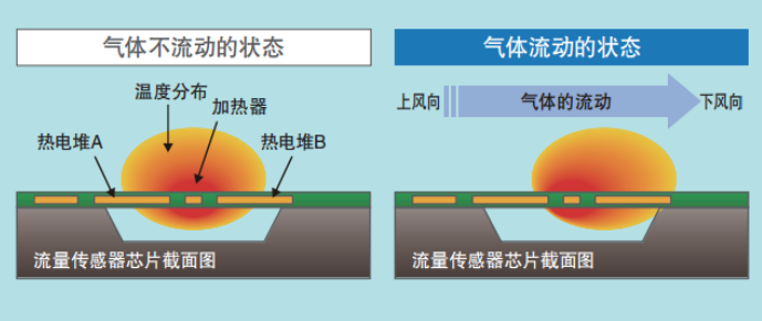 欧姆龙MEMS流量传感器检测原理:在没有气体流动的情况下以加热器为中心,温度分布左右对称。流动的状态下,加热器上风向的温度低,下风向温度高,温度分布不再对称。将该温差作为热电堆的电动势之差进行传感,可测量流量、流速而不影响温度、压力。此外,热电堆为热电动势方式,与电阻式相比,有助于降低功耗。