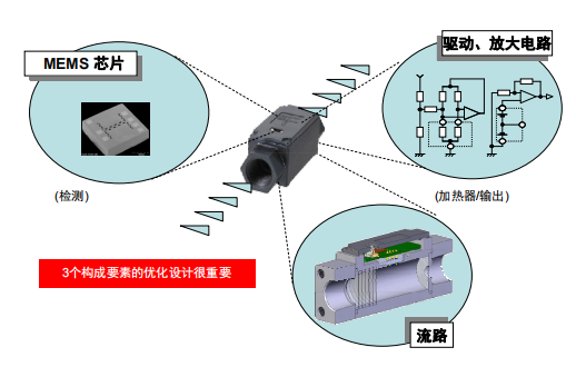 欧姆龙的流量传感器为气体专用,可测量各种气体的质量流量。流量传感器的基本构成由测量流量的 MEMS 流量传感器芯片、放大其输出的放大电路、以及根据使用用途经CAE(computer-aided engineering)优化的流路结构构成。由于气流是矢量流,因此这三个构成要素的优化设计非常重要。