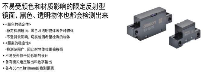 欧姆龙传感器抗阳光干扰强,可稳定检测镜面、黑色、透明物体,推出限定反射型传感器B5W系列。接受来自检测物体的反射光以检测物体有无,拥有限定了投光光束和受光区域的光学系统,仅可检测相距传感器一定距离(投光光束与受光区域重合的范围)的检测物体。
