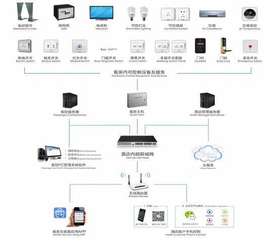客房智能控制主机、客房控制面板和客房管理软件三部分组成客房智能控制系统,并可以根据客户需求自由组合和扩展模块。通过弱电控制强电的方式,实现对照明、排气扇、空调、窗帘、音视频及服务信息等功能控制。采用TCP/IP协议或CAN-BUS总线组网,能够实现远程管理与控制,还可以与苹果(IOS)、安卓(Android)系统的移动终端设备无缝连接,可由移动终端设备进行控制,为客房营造典雅、温馨、舒适的环境,实现酒店的智能控制、绿色环保和高效管理。