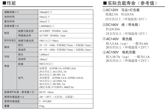 欧姆龙继电器性能参数: