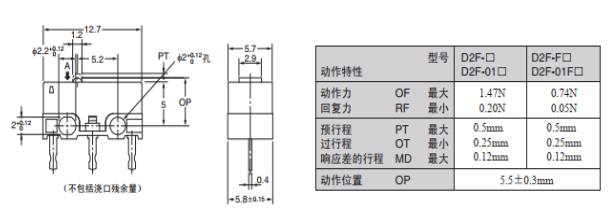 欧姆龙微动开关D2F-F的优势:超小型,性能稳定,动作力只需要0.74N,能够更精准地感应刹车片磨损的程度,为风力发电机的安全运作提供给更有力的保障,以下是D2F-F的尺寸图和动作特性。