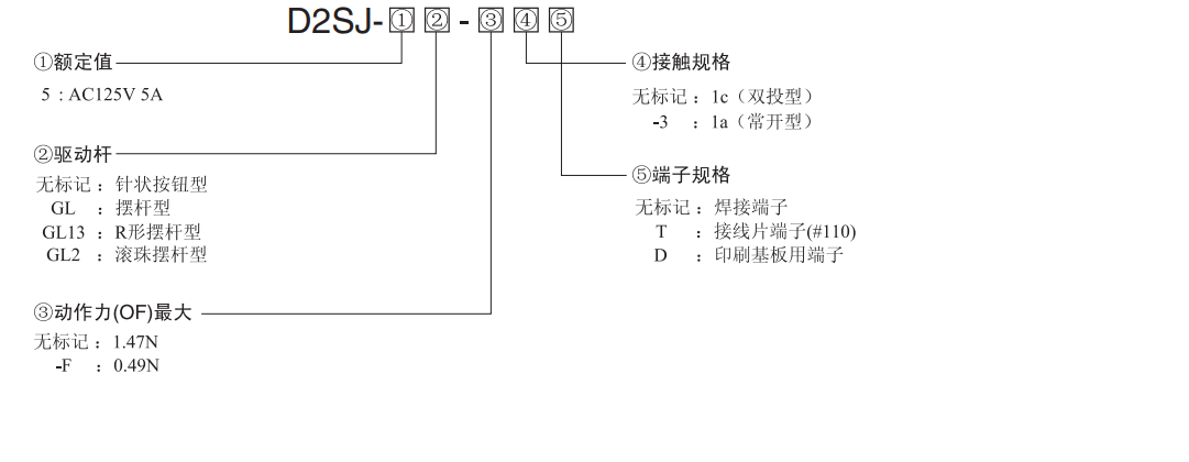 欧姆龙D2SJ微动开关构造简单、使用方便,可与SS系列安装互换,符合中国、北美和欧洲安全标准,配有焊接端子、#110接线片端子及印刷基板端子等特点。
