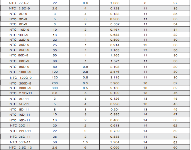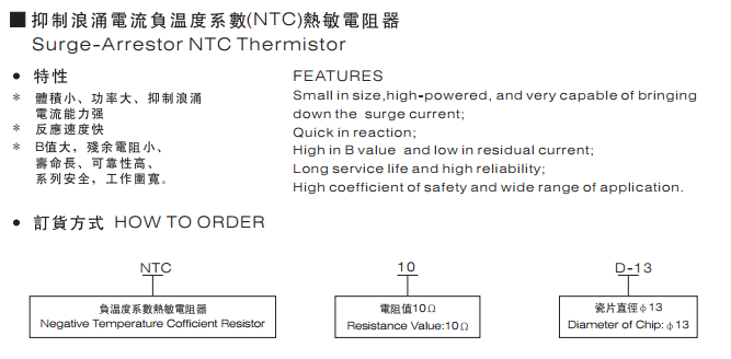 NTC热敏电阻器:是以锰、钴、镍和铜等金属氧化物为主要材料,采用陶瓷工艺制造而成的。NTC热敏电阻器在室温下的变化范围在10°欧姆~10⒍欧姆,温度系数-2%~-6.5%。它具有电阻值随温度的上升而下降的特性。适用于转换电源、开关电源、UPS电源、各类电加热器、电子节能灯、电子镇流器、各种电子装置电源电路的保护以及彩色显示管、白炽灯及其他照明灯具的灯丝保护。