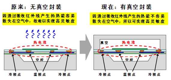 这次,世界首次成功将热电堆真空封装在芯片内。采用真空封装即可避免将热电堆转换的热能散失在空气中,使金属接点之间的温差变大,从而可实现更高的灵敏度。