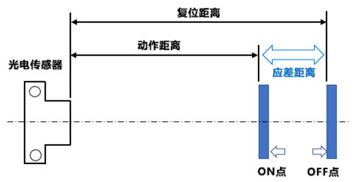 首先跟大家解释下何为应差,应差简而言之就是距离,那是哪里到哪里的距离呢?下文会为大家做一个详细的举例说明,其文字描述为反射型光电传感器时间动作距离与复位距离之差,称为“应差”。