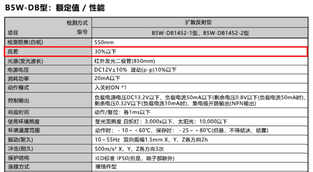 反射型光电传感器上的动作距离是指使检测物体接近传感器时切换为ON的距离。此外,使检测物体离开该范围并切换为OFF的距离称为复位距离。这个动作距离与复位距离之差称为“应差距离”(参考见下图)。如果无应差,则会在动作区域附近出现反复切换ON/OFF的现象(震颤)。为了防止这种现象的发生,需要设定应差。B5W-DB型的应差规定在30%以下。例如,某单体以800mm的距离切换为ON时,表示复位距离为800 mm X 1.3 =1,040 mm以下。