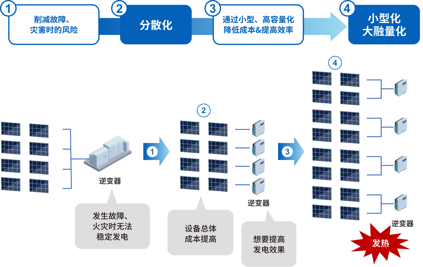 近年来,太阳能发电系统上的需求不断发生变化。作为地震或水灾等灾害风险对策,更加稳定的电力供给需求愈发高涨,并出现了从集中型系统向分散型系统转化的趋势。并非通过1台光伏逆变器执行电力转换,而是分散至多台光伏逆变器,由此降低了发生灾害时因设备故障等所致发电停止的风险。此外,各设备或机器上通过高容量、大电流化的配置提高了发电效率,并通过小型化、轻量化削减了设备投资,因而要求有效利用设备的呼声愈发高涨。而另一方面,伴随小型化、高容量化的发展,当务之急是减少设备本身产生的热量,这是造成能量损失和降低设备使用寿命的一个因素。