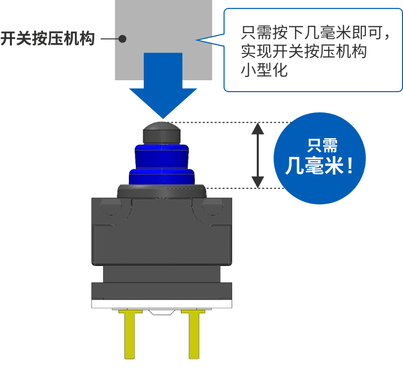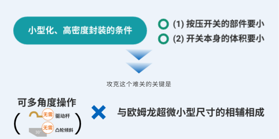 实现(1)和(2)最简单的方法就是从正上方按压,也就是从行程(完全按下开关的距离)最短的角度按压。但要设计行程只有几毫米的超微小型开关的垂直按压并不容易。