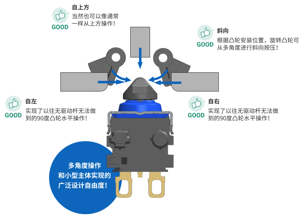 D2EW开关通过欧姆龙全新研发的独特按钮形状,无需驱动杆、无需倾斜水平凸轮即可从水平方向进行操作。除了水平方向,还可从其他角度进行操作。(参照下图)