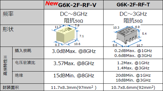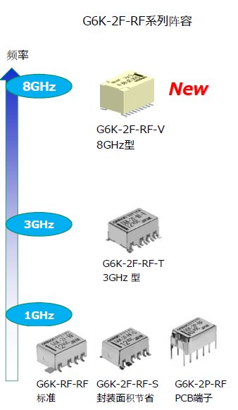 全新欧姆龙高频信号继电器G6K与G6KU,适合ATE(半导体自动测试仪器)市场的更高频率要求。其中G6K-2F-RF-V其DPDT(双刀双掷开关)适用于差分传输信号;相比其他信号继电器,切换信号性能更优质,用于高速信号切换,可达9.6Gbps。功耗更低,可达100mW;体积更小。鼎悦电子推出的G6K与G6KU高频继电器;外L型端子设计实现良好牢固度,更易于继电器安全检测、PCB维修及更换。