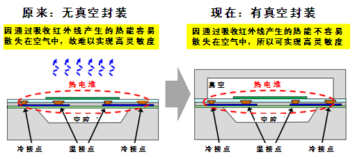 这次,世界首次成功将热电堆真空封装在芯片内。采用真空封装即可避免将热电堆转换的热能散失在空气中,使金属接点之间的温差变大,从而可实现更高的灵敏度。