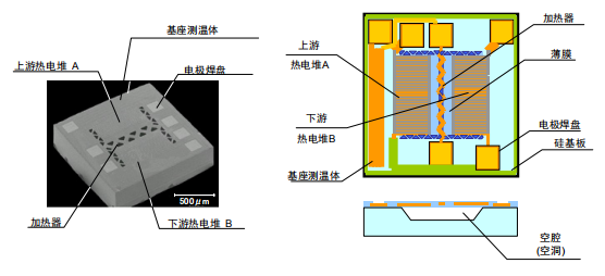 MEMS 流量传感器芯片的基本结构如图 3 所示。这种传感器芯片采用使用热线的质量流量检测方式。其芯片中央具有加热器,上游侧的热电堆 (A)及下游侧热电堆 (B)配置在加热器的两侧,热电堆附近配置有基座测温体,它们均是采用半导体工艺制造的。加热器和热电堆列组的底部形成空腔,使得热电堆可高效检测加热器的热量。