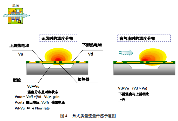 如图 4 所示,恒定电流流向芯片中央的加热器,产生热量。无风时,加热器周围的热分布是对称的,因此 Vu 和 Vd 两个热电堆的电动势相等。