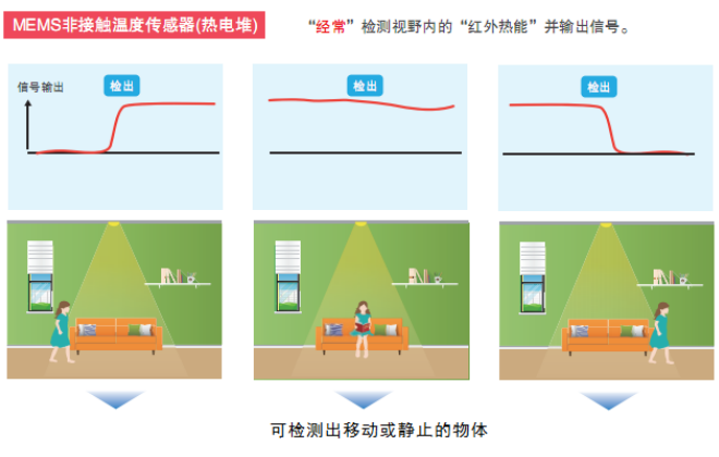 欧姆龙自主研发的D6T系列非接触温度传感器, 采用独创的MEMS技术,将热电堆元件和ASIC封装在一起,实现了精度高,体积小,便于嵌入多种电子产品等特点。与热释电型红外传感器相比, 欧姆龙D6T系列非接触传感器不仅可以检测动态物体,也可检测静止物体。通过物体表面细微的温度差和温度变化进行检测, 不仅适用于家电节能、安防设备、楼宇建筑等领域,也适用于护理看护类的应用场景。