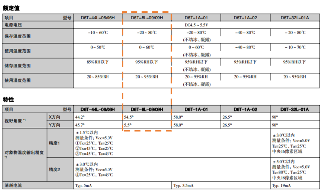欧姆龙非接触温度传感器D6T-8L-09以其红外测检测,I2C数字输出,抗干扰性强三大优势为您的产品增加人体感应功能,让您的产品稳定可靠,独具特色。此传感器像素为1x8,检测区域呈长条形,横向视场角54.5°,纵向视场角 5.5°,可根据产品的实际应用进行安装角度调整。