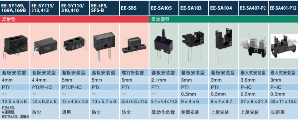 欧姆龙型号EE-SF5,SF5-B反射式光电开关可应用于:小家电、照相机、投币机、扫描仪、读卡装置、游戏机、ATM机、验钞、点钞机、打印机、纸检装置、复印机、传真机、扫描仪、条码阅读器、自动售货机、自动售票机、等一些光电产品。