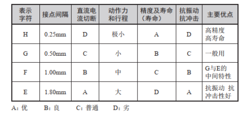 不同的接点间隔,开关行程的移动差(即MD:从驱动杆的动作位置到复位位置的移动距离或者移动角度)、灵敏度、寿命、直流电流切断、抗冲击、抗振动的能力都不同。