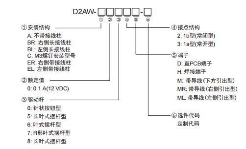 欧姆龙D2AW微动开关具有小型的外观尺寸,并且根据安装结构、额定值、驱动杆类型、节点结构、端子以及定制代码的不同,可提供多种型号产品,以便客户根据实际应用需求进行选择。