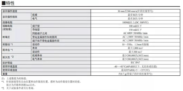 欧姆龙D2AW微动开关的机械寿命和电气寿命均为至少200,000次(30次/min),符合IEC IP67防护等级,在60%RH以下、无结冰或结露的情况下,能够在-40℃~+85℃的温度范围内工作,而在最高95%RH的环境中,能够在+5~+35℃的温度范围内工作。不仅如此,该开关还具有很强的耐电压性和耐冲击性,可适用于工作条件较为严苛的环境中。