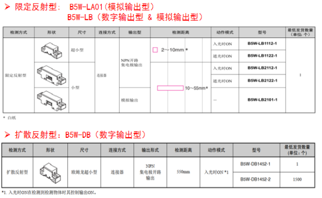 欧姆龙B5W系列传感器有数字输出型和模拟输出型,,同时根据不同检测距离可以适时选择。