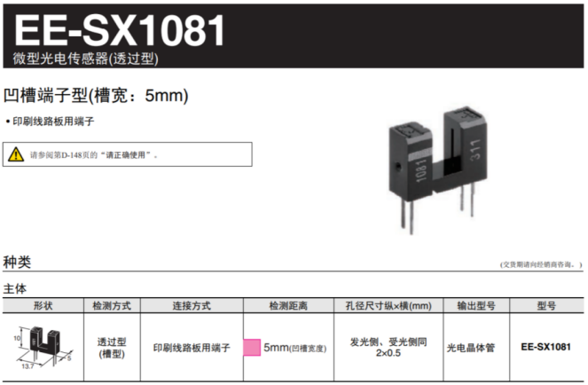 EE-SX1081 是一款透射式光电传感器, PCB安装。光电传感器是一种紧凑型光学传感器, 可通过光束感应物体的位置。通用型号带有5mm宽槽。高分辨率0.5mm宽孔径, 光电晶体管传感器输出。透射式光电传感器包含发射器和检测器, 面对对方, 当物体位于发射器和检测器之间, 物体会拦截发射器的光束, 从而减少检测器接受的光信号。-25至85°C 工作温度范围