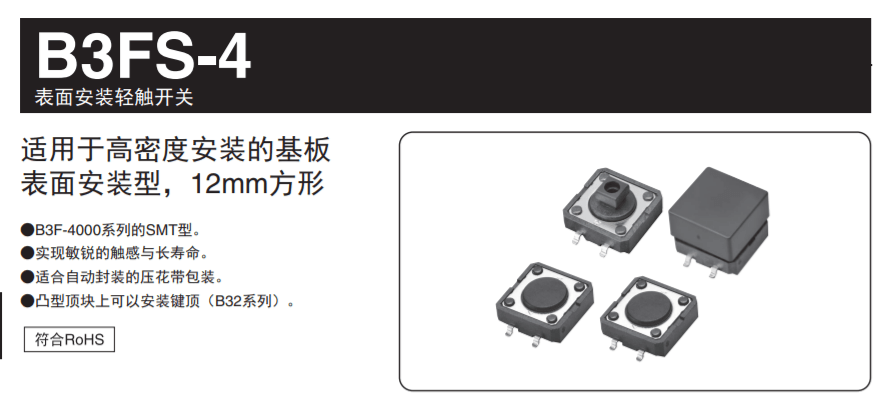 我司备有各种轻触开关都可以用于各类农机控制器中;其中平地仪还会用到轻触开关B3FS-4系列;欢迎电话咨询广州鼎悦电子科技有限公司;相信我们可以带给您不一样的选择;如图:
