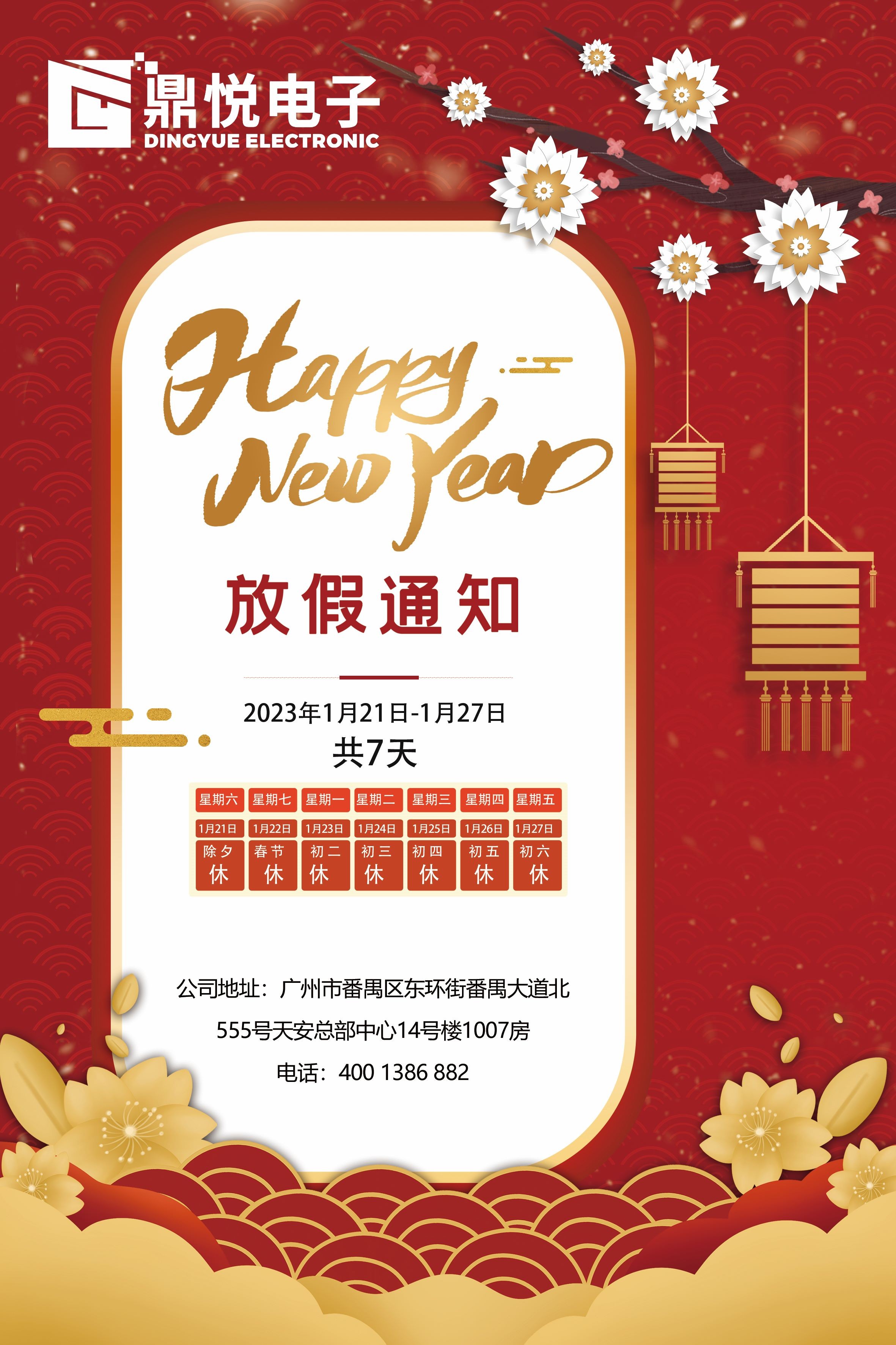 您好!感谢您对鼎悦电子的支持和厚爱!正值新春佳节来临之际,广州鼎悦电子科技有限公司携全体员工在此向您及您的家人送出最真挚的祝福:祝您新年快乐!万事如意!在新的一年里身体健康!事业更上一层楼!在新的一年里我们也将以更真诚,专业的服务回馈广大客户!