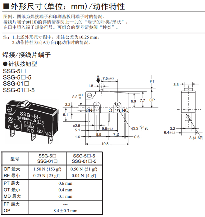 | 焊接端子 | 0.20 N {20 gf | SSG-5L1H-5 | SSG-01L1H-5 | |