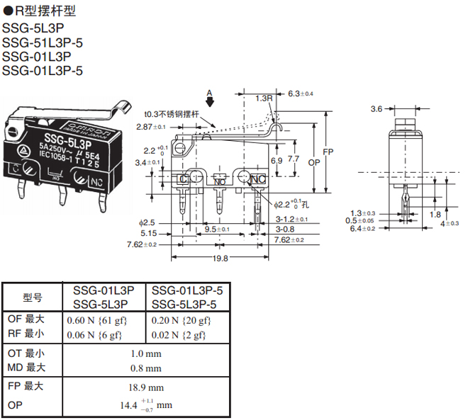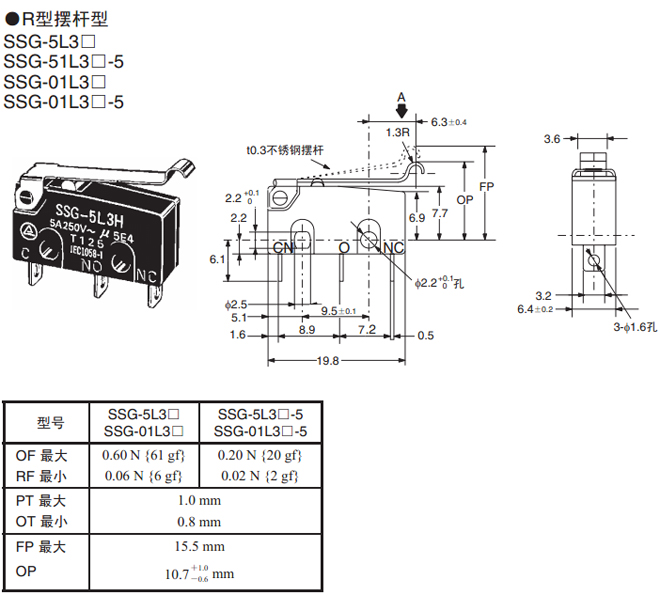 | R型摆杆型 | 焊接端子 | 0.60 N {61 gf} | SSG-5L3H | SSG-01L3H |