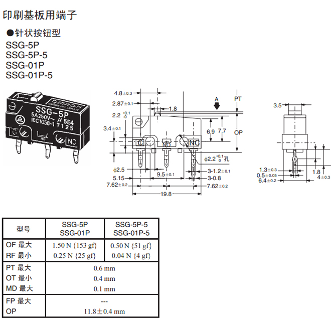 | 针状按钮型 | 焊接端子 | 1.50 N {153 gf} | SSG-5H | SSG-01H |
