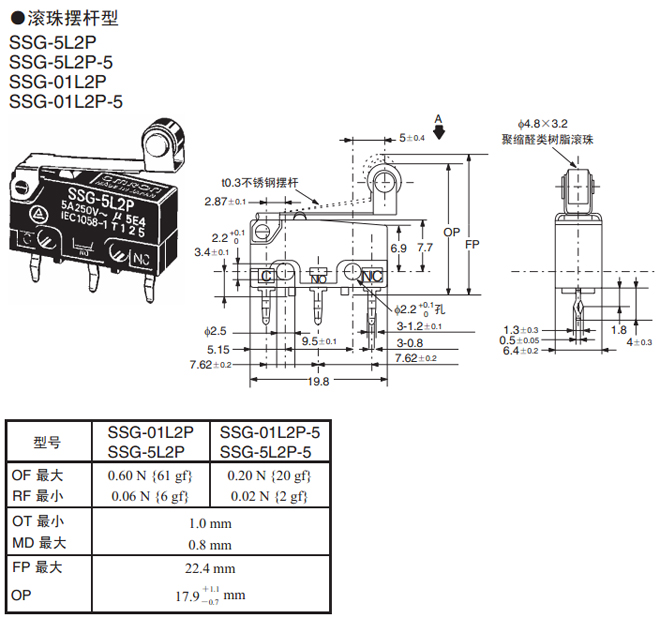 | 滚珠摆杆型 | 焊接端子 | 0.60 N {61 gf} | SSG-5L2H | SSG-01L2H |