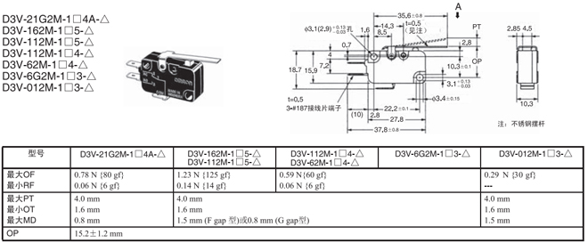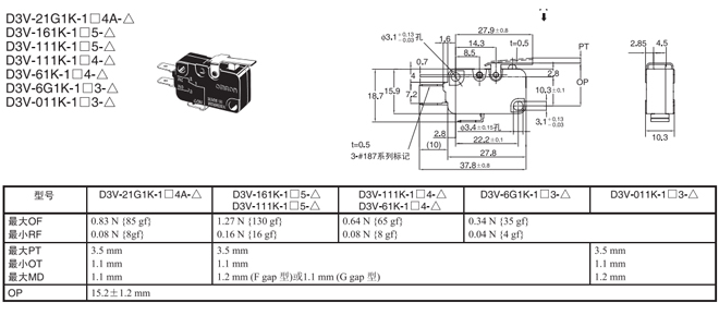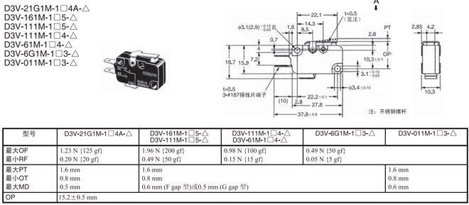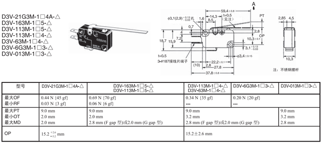 | 针状按钮型 | --- | 1.23N {125gf} | D3V-21G-1□4A-△ | D3V-21G-2□4A-△ | D3V-21G-3□4A-△ |