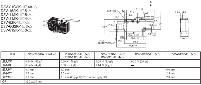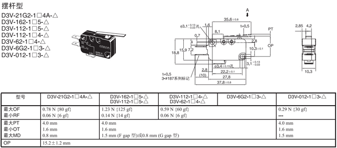 | R型摆杆型 | 内部安装 | 0.83N {85gf} | D3V-21G4-1□4A-△ | D3V-21G4-2□4A-△ | D3V-21G4-3□4A-△ |