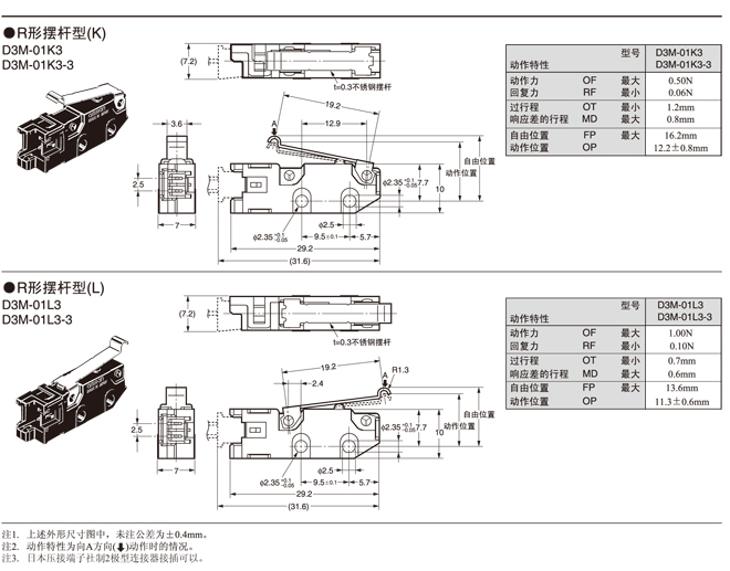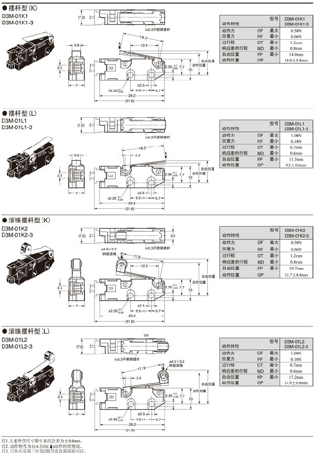 在针状按钮型中为了自由位置和总行程位置的数据,在摆杆型中为总行程位置的数据。 接点的闭路或开路在1ms以内。 |
