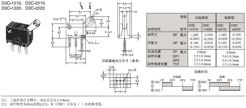 D3C 超级小型检测开关 采用滑动式的超小型开关 超小型(高6×宽8×深4.2mm),轻量(约0.3克),3mm的长行程。 由于是滑动方式,所以短路、非短路的切换时间可根据使用用途进行选择。