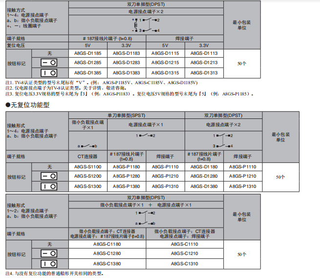 A8GS 远程复位 船形开关 带复位功能船形开关 利用基于外部信号的 “复位功能”关闭电源开关,设备的待机功率为零。 适用于浪涌较大的负载的电源ON/OFF。适用于TV-8(浪涌特性117A)。 备有适用于微小负载领域的接点构造种类。 备有可同时ON/OFF微小负载领域、高负载领域的2极规格种类。 接点间隙大于3mm。 取得UL、cUL标准认证,并符合EN标准。
