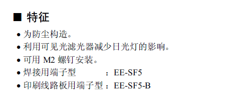 EE-SF5 微型光电传感器[反射型] 为防尘构造。 利用可见光滤光器减少日光灯的影响。 可用M3 螺钉安装。 焊接用端子型:EE-SF5 印刷线路板用端子型:EE-SF5-B