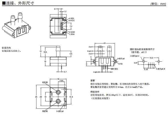测量范围:±500Pa 小型、高精度、耐环境性能卓越的差压传感器 ±3%RD的高精度。 具备直线补偿、温度补偿功能。 数字输出(I2C通信)。 高流量阻抗减少旁路配置的影响