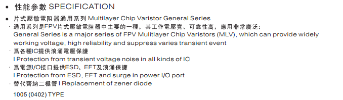 特征: 1、叠层片式陶瓷结构。 2、无引线。 3、温度范围:-55℃~+125 ℃。 4、工作电压范围V w(dc)=3.3~ 615V。 5、具有双向限制特性,适合ESD保护。 6、漏电流非常小。 7、寄生电感小、响应速度快(响应时间少于0.5ns)。 8、优良的温度系数。 9、良好的焊接性能(端电极为三层电镀)。 应用: 1、防止过电压:当施加的电压升高到压敏电压时,压敏电阻器的电流急剧上升,被保护设备的浪涌电压迅速减小,从而使装有压敏电阻器的设备抗浪涌噪声能力达到相应要求。压敏